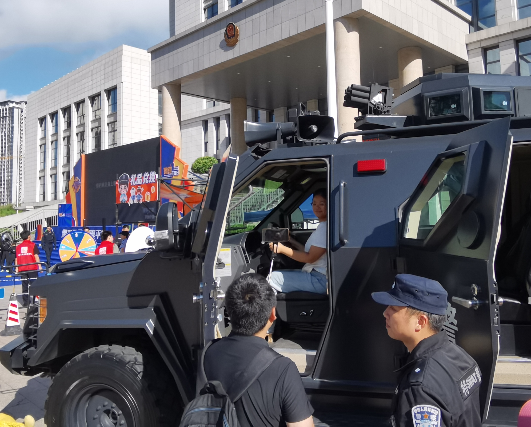 裝備展示區(qū)更成了群眾“零距離”接觸警務(wù)裝備的“科普課堂”。警員們細(xì)致地向群眾講解了盾牌、戰(zhàn)盔、防毒面具、防彈衣等警用裝備的功能及使用規(guī)范;炫酷的警用摩托車、威武的裝甲車等裝備一字排開,成為現(xiàn)場(chǎng)的“網(wǎng)紅打卡點(diǎn)”。小朋友們爭(zhēng)相爬上裝備參觀,眼神里滿是向往,家長們則舉著手機(jī)記錄精彩瞬間。通過“看得見、摸得著、問得清”的互動(dòng),群眾既認(rèn)識(shí)到警用裝備的嚴(yán)肅性,更真切體會(huì)到警察守護(hù)平安沉甸甸的責(zé)任感。