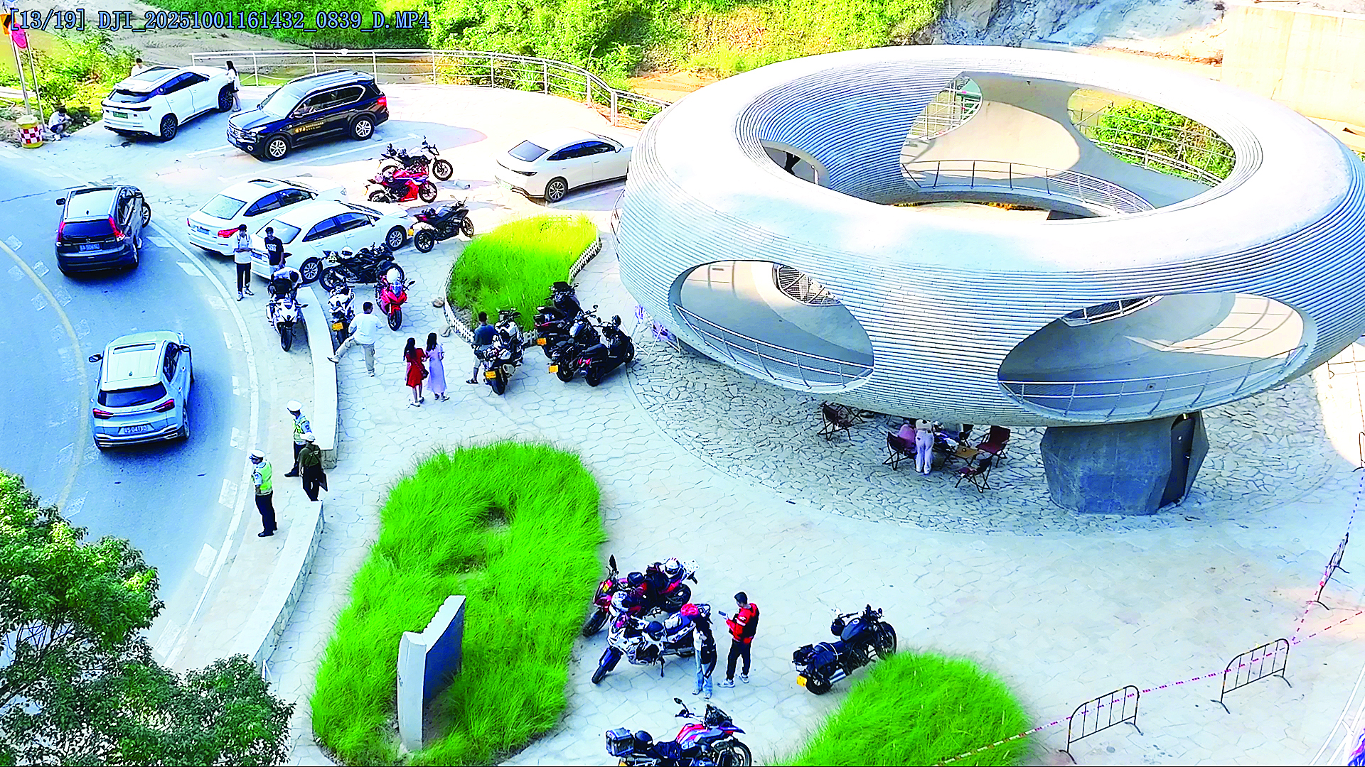 218最美旅游公路沿途設(shè)置的藝術(shù)裝置,既是網(wǎng)紅打卡點,也是游人休憩的好去處。在博羅段中,綠屏石灘藝術(shù)裝置尤為吸睛。直徑16.5米的觀景環(huán)凌空懸于峭壁邊緣,下沉廣場與漂浮平臺構(gòu)成的雙層標(biāo)高景框,恰好將山水風(fēng)光框成一幅流動的畫,成為游客定格美景的絕佳選擇。休憩區(qū)里,摩旅愛好者與騎行愛好者圍坐閑談,手捧特色豆花拿鐵,你一言我一語分享著沿途所見的秀麗風(fēng)光!耙宦凤L(fēng)景絕了!各個驛站和藝術(shù)裝置的間距特別合理,騎累了就坐下喝杯咖啡、看看山景,這種邊騎邊玩的愜意,是其他路線比不了的。”騎行愛好者鄧先生贊不絕口。他說,騎行群里常有人分享這條公路的美景與攻略,趁著國慶假期,他立刻約上好友來一場深度體驗。羅浮山茶、東坡茶樂事等本地特色飲品,剛推出就成了游客爭先品嘗的“爆款”。