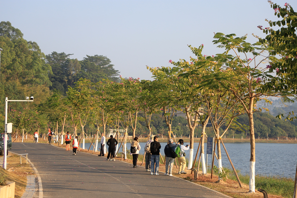 此次徒步線路全程57公里,其中約36公里綠道,18公里鄉(xiāng)道和村道,3公里機耕路,途經(jīng)長寧鎮(zhèn)、橫河鎮(zhèn)、湖鎮(zhèn)鎮(zhèn),再回到羅浮山風(fēng)景名勝區(qū)旅游文化廣場。沿途山水相依,綠美相隨,美景填滿了大家的雙眼。作為途中的“重頭戲”,“小洱海”再次出圈,不管是初來乍到,還是二次相遇,或是多次光臨,驢友們都不吝嗇贊美之詞。據(jù)悉,此次徒步活動吸引了來自惠州、廣州、深圳、東莞、佛山、珠海、中山、上海、香港、澳門等全國各地驢友前來參與。來自深圳的谷女士帶著丈夫、兒子一家三口前來參加活動。在“小洱!保麄兌啻畏怕_步,拍照打卡。她興奮地說:“手機的內(nèi)存空間,都快要報警了!