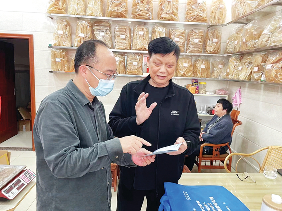 社區(qū)工作人員向沿街商鋪發(fā)放文明宣傳手冊。 惠州日報(bào)記者匡湘鄂 曾靜妍 攝