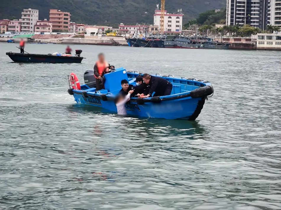 到達現(xiàn)場后,值班民警發(fā)現(xiàn)一名男子他正搖搖晃晃走向海中去。情況緊急,值班民警立即乘船向男子方向追趕、呼喊:“停下來,有什么事情我們可以慢慢聊一下,不要想不開!”,危急時刻,澳頭派出所值班民警快速到達該男子落水點,奮力將其拉回船上。