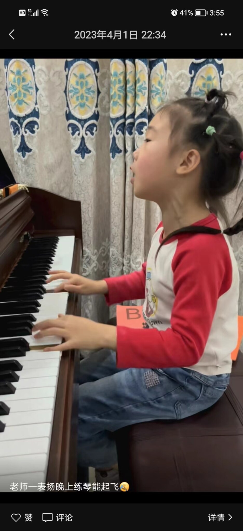 王女士說,4月1日晚上10點半,她看時間比較晚了,就囑咐云朵彈完最后一遍《我們的祖國是花園》趕緊睡覺,彈的時候她就用手機錄了下來!拔腋f‘哇哈哈’沒有這么快的,她說‘哇哈哈’就是這么歡快的,她對歌曲有自己的理解!蓖跖空f,當(dāng)時她在朋友圈也發(fā)了,還配了一段文字“老師一表揚,晚上練琴能飛起”,說的就是當(dāng)時云朵一邊彈琴一邊唱的激情狀態(tài)。