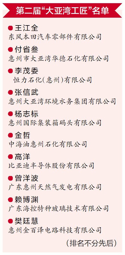 惠州日報訊 (記者匡湘鄂)日前,大亞灣開發(fā)區(qū)第二屆“大亞灣工匠”評選結(jié)果出爐,東風(fēng)本田汽車零部件有限公司王江全等10人獲“大亞灣工匠”稱號。