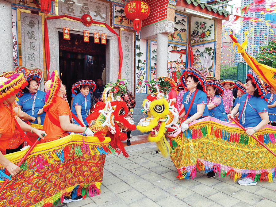 巡游隊(duì)伍回到天后宮后,村民們滿懷虔誠(chéng)將媽祖神像“送”回原位。舞龍、舞獅、劃龍船等各支隊(duì)伍繞著天后宮輪流表演,將活動(dòng)氛圍推向高潮。
