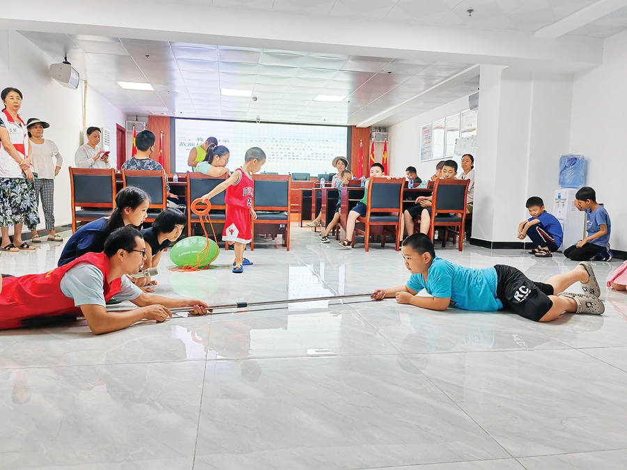 “如果自己不慎落入水中,首先保持冷靜,適當(dāng)放松,頭向上保持仰躺姿勢或水母漂,等待救援!薄叭绻l(fā)現(xiàn)有人溺水,首先要大聲呼救、報警,然后尋找合適的工具,在保護(hù)好自己的條件下施救……”在講課中,石亮首先通過提問方式,與孩子們圍繞發(fā)生溺水危險時如何自救與救人展開熱烈討論,隨后用通俗易懂的語言講解正確方法,并邀請孩子們現(xiàn)場演示。孩子們在生動的情景演示中,很快掌握了救人所需工具及方法。