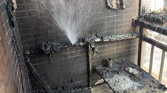 電瓶燃燒燒破陽臺pvc水管,水管噴灑出水將火情控制,火勢未進(jìn)一步擴(kuò)大。事發(fā)后內(nèi)部墻體被濃煙嚴(yán)重熏黑,現(xiàn)場一片狼藉,所幸未造成人員傷亡。