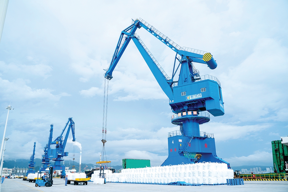 離PTA主裝置區(qū)約一公里處,便是恒力石化(惠州)有限公司通用碼頭。碼頭上是項目最繁忙的地方,只見一輛輛拖車將一包包PTA產(chǎn)品拉到碼頭上有序碼垛好;碼頭泊位上?恐3艘輪船,高大的門機(jī)起重機(jī)將碼垛好的PTA產(chǎn)品吊到船艙。