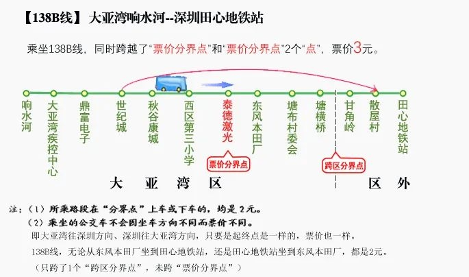 138B線的“跨區(qū)分界點”在大亞灣【塘橫橋】站與深圳【甘角嶺】站之間;“票價分界點”設(shè)在【泰德激光】站。