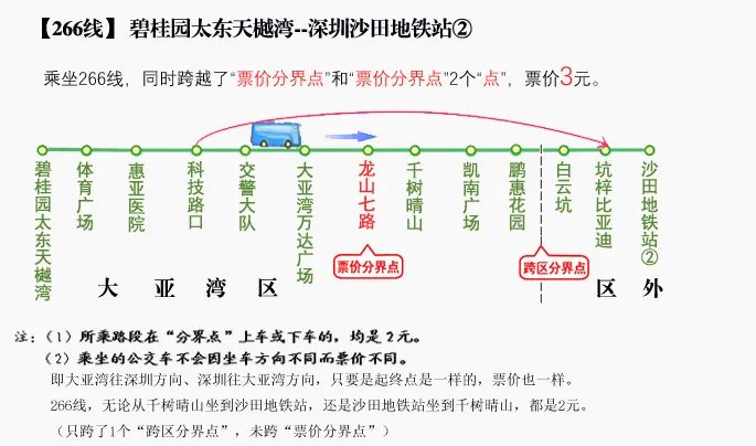 266線的“跨區(qū)分界點”在大亞灣【鵬惠花園】站與惠陽【白云坑】站之間;“票價分界點”設(shè)在【龍山七路】站。