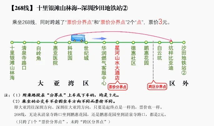 268線的“跨區(qū)分界點”在大亞灣【鵬惠花園】站與惠陽【白云坑】站之間;“票價分界點”設(shè)在【星河山水大酒店】站。