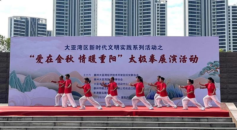 惠州日報訊 (記者匡湘鄂 通訊員彭麗麗 詹彩鳳)時而如行云流水,時而剛勁有力,一柔一剛中盡顯太極的精妙……10月23日是今年的重陽佳節(jié),當(dāng)天上午,大亞灣區(qū)新時代文明實踐系列活動之“愛在金秋 情暖重陽”太極拳展演活動在惠民廣場舉行,來自區(qū)太極拳協(xié)會、區(qū)廣場舞者協(xié)會的16支參演隊伍參加活動,展現(xiàn)了大亞灣老年人的風(fēng)采。