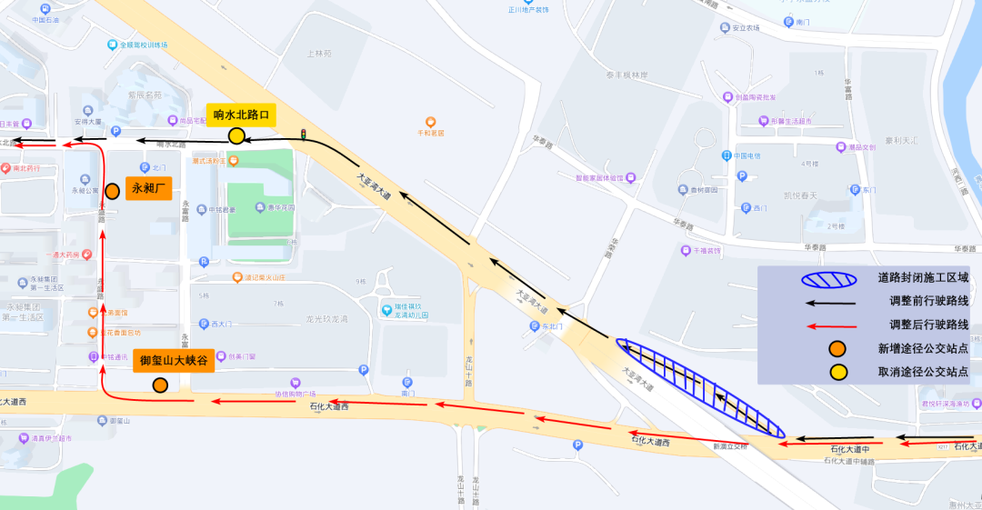 霞涌黃金海岸發(fā)出:在石化大道直行后轉(zhuǎn)入永盛路、響水北路、大亞灣大道行駛。
