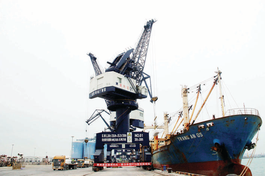 恒力PTA外貿(mào)首船在惠州港業(yè)通用碼頭?垦b船。 惠州日?qǐng)?bào)記者曾靜妍 通訊員林麗濱 攝