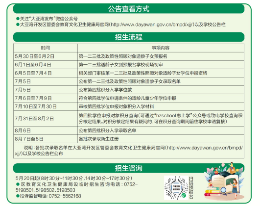 《公告》具體內(nèi)容、招生計(jì)劃及學(xué)區(qū)劃分情況等信息,可通過(guò)“大亞灣發(fā)布”微信公眾號(hào)和大亞灣開發(fā)區(qū)網(wǎng)站的教育文化衛(wèi)生健康局部門頻道查詢。
