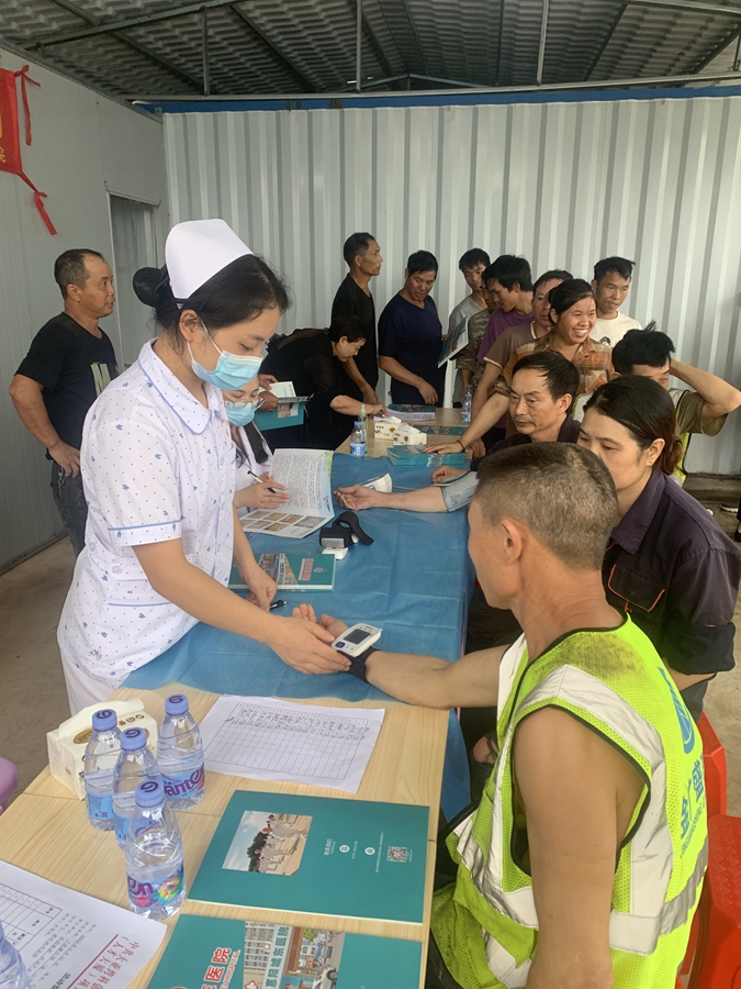 醫(yī)務(wù)人員為工友們測(cè)血壓。惠州日?qǐng)?bào)記者張宇琪 通訊員張雪玲 攝
