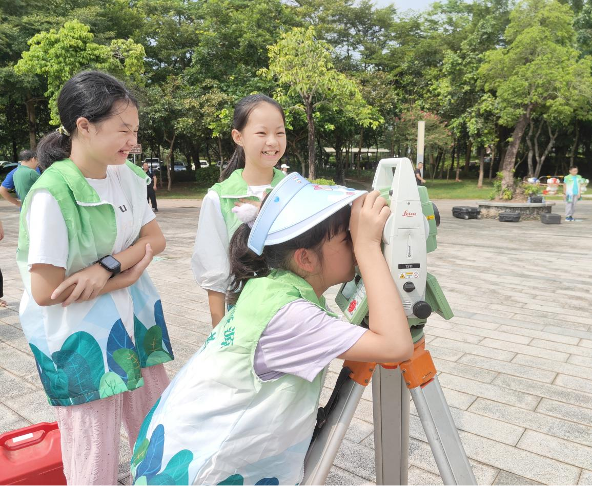 在大亞灣紅樹林城市濕地公園,大亞灣經(jīng)濟技術(shù)開發(fā)區(qū)測繪院的工作人員現(xiàn)場演示測繪儀器的使用,帶領(lǐng)“小記者”們親身體驗使用水準儀、全站儀、GPS測量議等測繪裝備,觀看無人機操作。