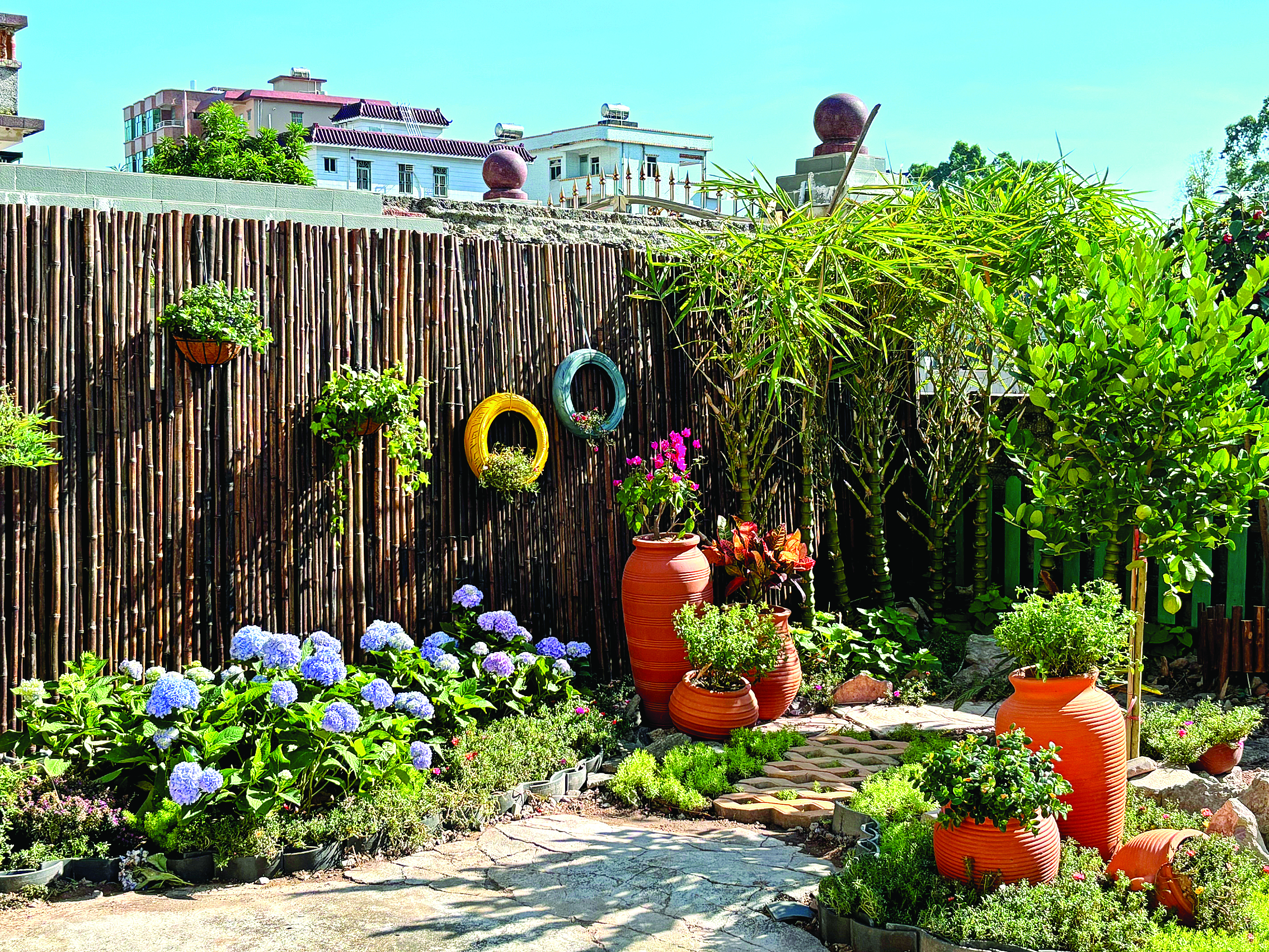 在村民陳秀碧家的庭院前,一株形態(tài)別致的羅漢松傲然挺立,茶花、桂花與杜鵑花等花卉沿著戶外的圍欄編織成一圈絢爛的花環(huán),房前屋后的繡球花、太陽花競(jìng)相綻放。這些花卉均由區(qū)婦聯(lián)特邀園藝師設(shè)計(jì)并栽種,旨在將自然之美融入村民的日常生活。