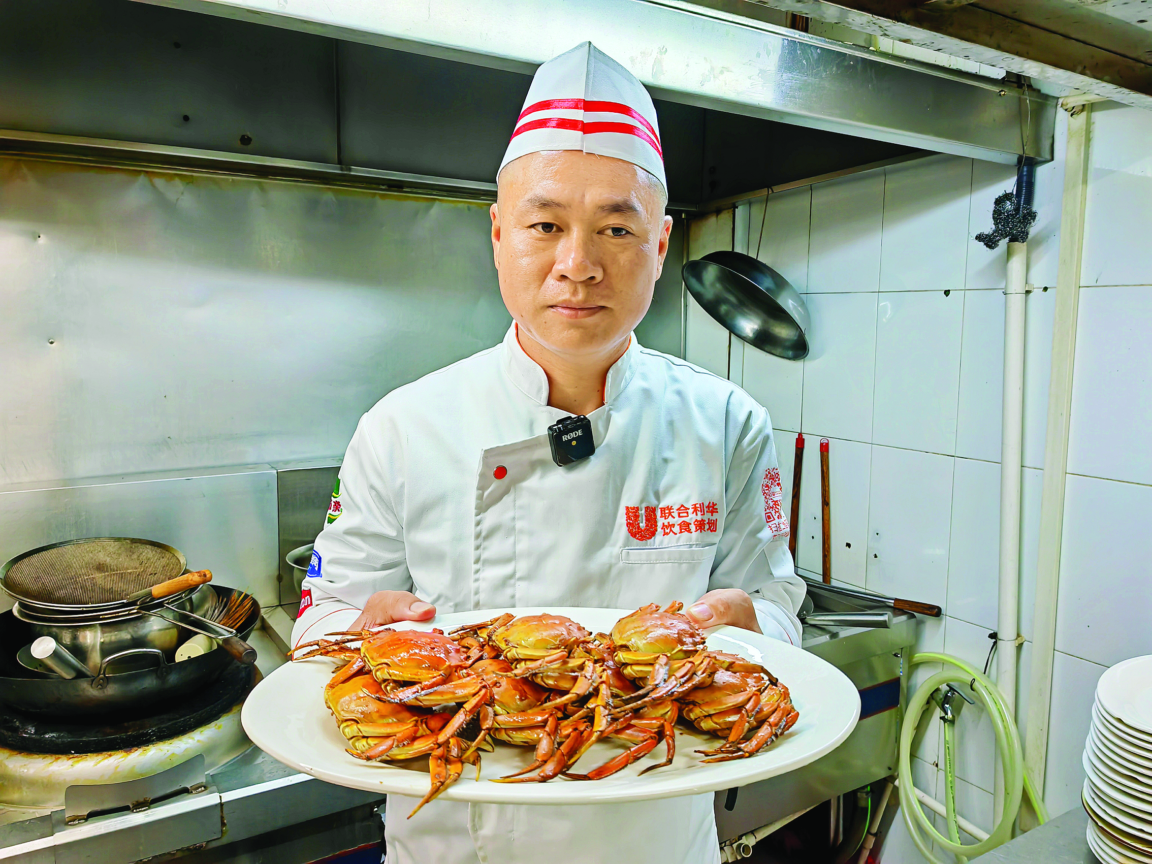 早上剛從大亞灣海域打上來的螃蟹威猛有力,廚師陳師傅選的都是個頭在二兩半左右的母蟹,個個膏滿黃肥。