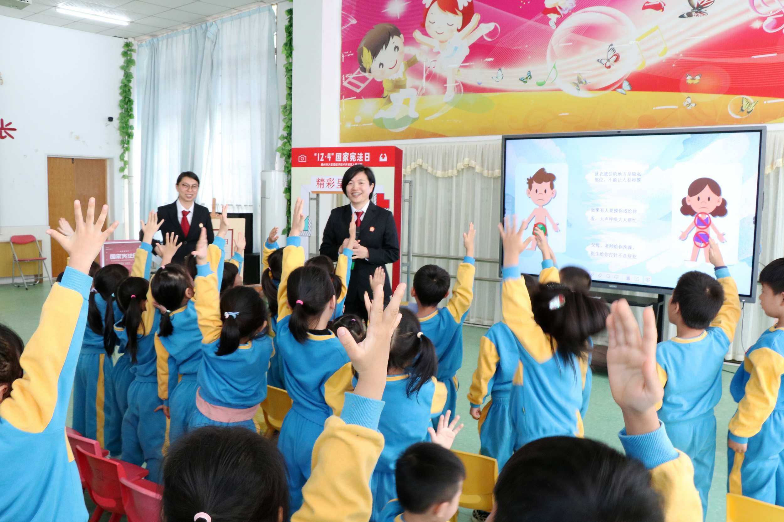 當法官走下審判高臺,走進幼兒園,面對40名小萌娃上課,是一種怎樣的體驗?望著教室里兩位穿著制服的阿姨,萌娃們睜大了好奇的眼睛。“小朋友們好!我們是來自大亞灣法院的法官阿姨!”大亞灣經(jīng)濟技術(shù)開發(fā)區(qū)人民法院綜合審判庭法官徐黎指著胸口上的法徽,解答了孩子們的疑惑。12月3日,在第11個國家憲法日來臨之際,大亞灣區(qū)法院走進大亞灣西區(qū)中心幼兒園,為40名兒童上了一堂知識與童趣相碰撞的法治啟蒙課。