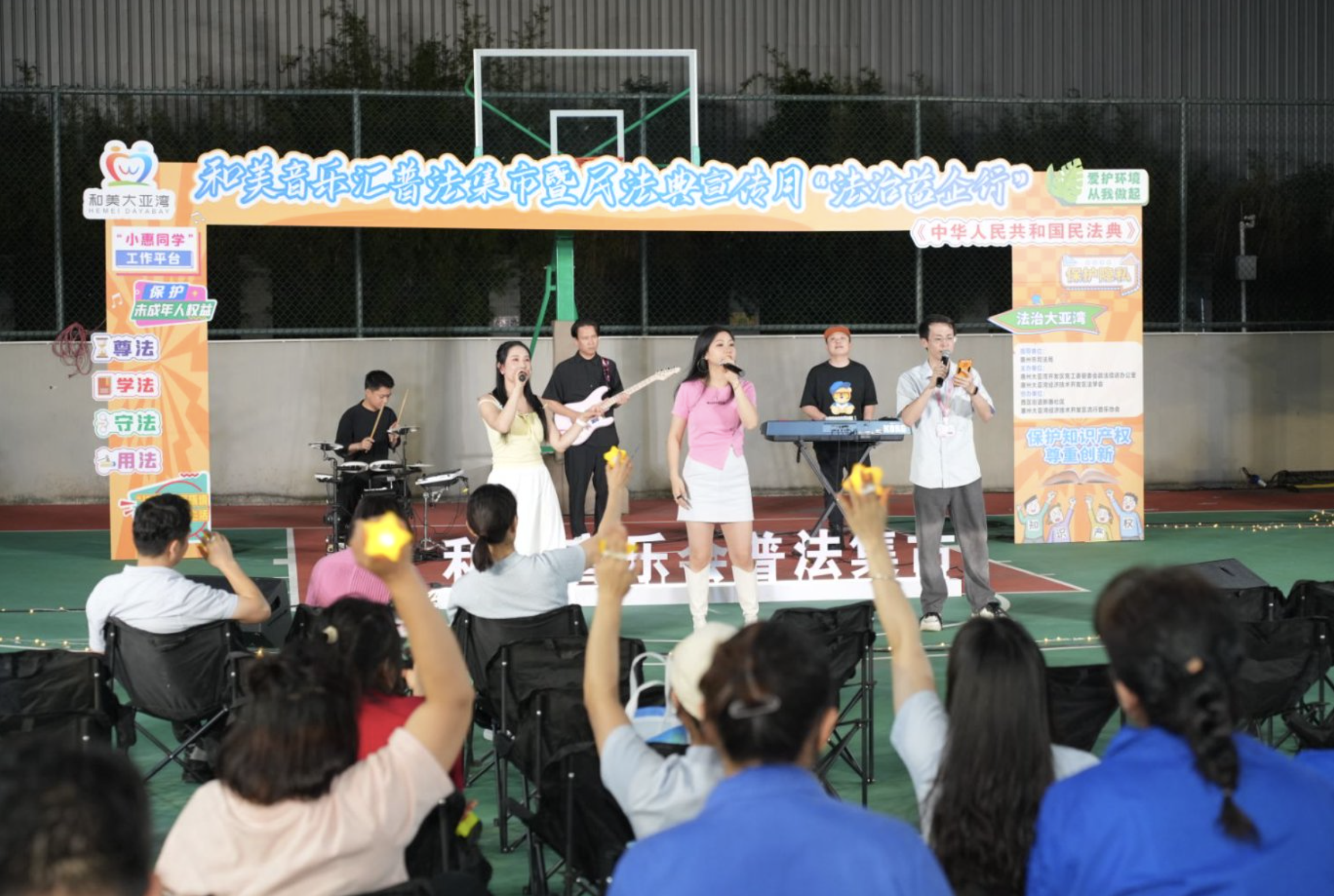 惠州日?qǐng)?bào)訊 (記者曾靜妍 通訊員徐堃棚)初夏夜晚,微風(fēng)習(xí)習(xí)。產(chǎn)業(yè)園內(nèi)動(dòng)聽(tīng)的旋律悠揚(yáng)飄蕩,吸引了一群群下班后的勞動(dòng)者駐足聆聽(tīng)。5月27日傍晚,大亞灣開(kāi)發(fā)區(qū)西區(qū)海能新一代信息產(chǎn)業(yè)園熱鬧非凡,一場(chǎng)和美音樂(lè)匯普法集市暨民法典宣傳月“法治益企行”活動(dòng)在此舉行。勞動(dòng)者們齊聚一堂,不僅享受了一場(chǎng)正能量滿滿的音樂(lè)會(huì),還獲得了法治宣傳、法律咨詢、益企政策解讀等服務(wù)。