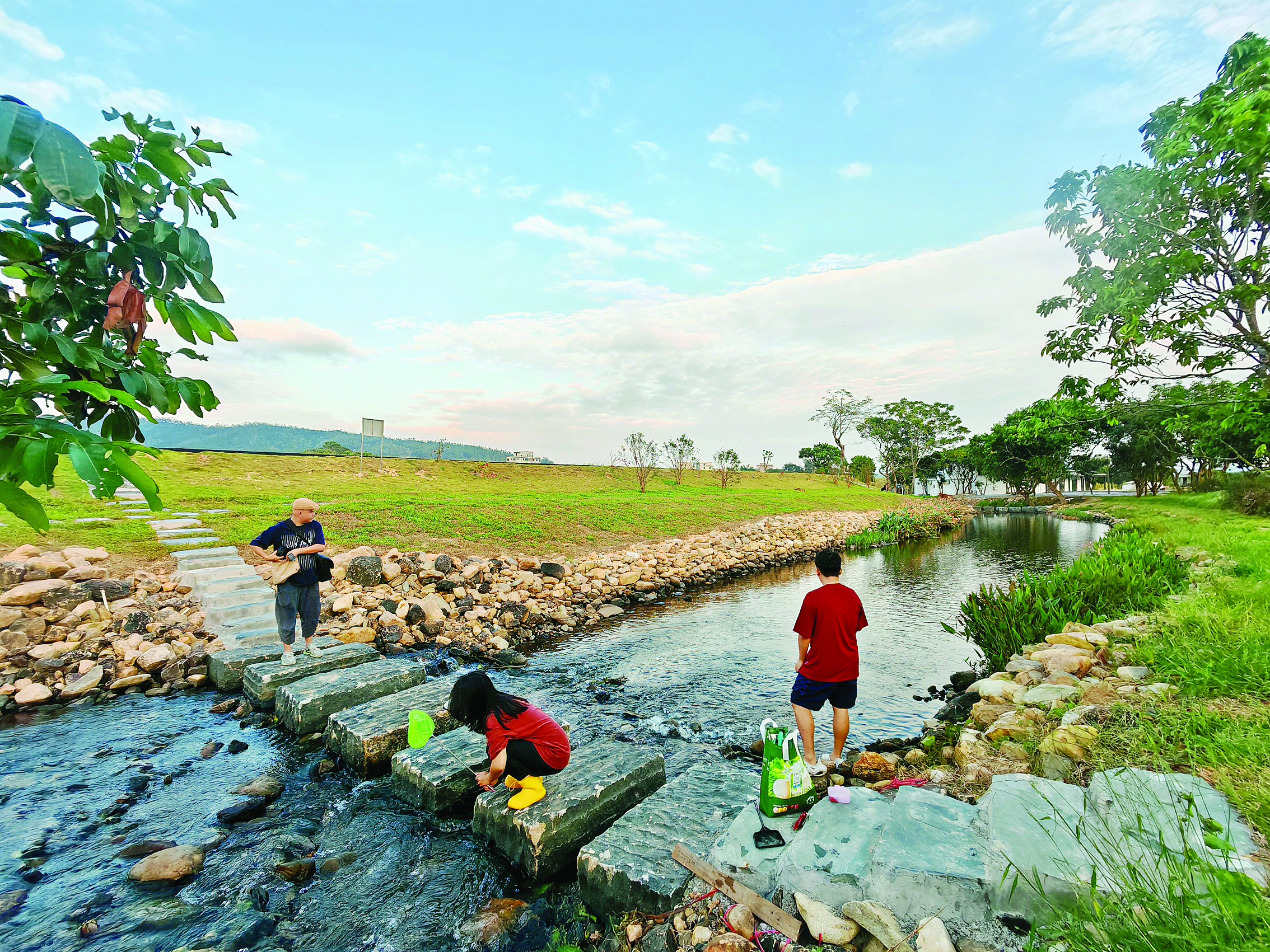 青龍河畔原本荒廢的耕地已全面翻耕,重現生機。河岸邊修建了平整的機耕道,也是一條農業(yè)觀光步道。沿著這條嶄新的步道漫步,只見清澈的河水緩緩流淌,水面波光粼粼,美人蕉等水生植物與清澈的河水相映成趣。河面上的幾處汀步,方便行人過河,也成為河流小景。原本雜亂的河岸鋪上了草皮,錯落有致地種植著花草。岸邊原有的荔枝樹郁郁蔥蔥,為人們提供了一片清涼的綠蔭。