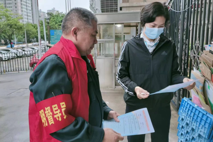 志愿者向居民群眾發(fā)放調(diào)查問卷,宣傳文明創(chuàng)建知識(shí)。