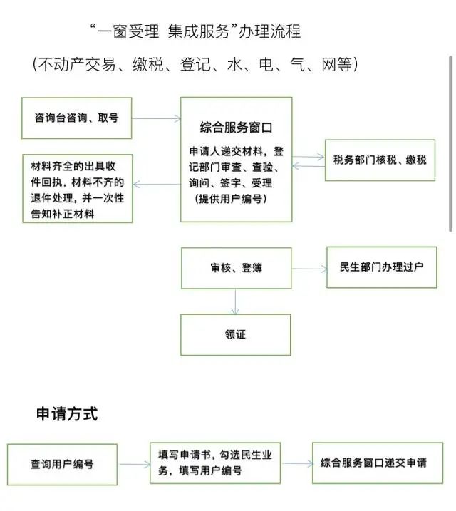 群眾申請——綜合服務(wù)窗口受理(一次性收取不動產(chǎn)登記、用水、用電、用氣、用網(wǎng)、維修基金業(yè)務(wù)所需的申請材料)——審批登簿(同時(shí)將用氣、用網(wǎng)、維修基金業(yè)務(wù)受理信息和收件材料分別共享給供水、供電、燃?xì)狻V電網(wǎng)絡(luò)、維修基金管理部門)——民生部門依據(jù)共享信息和材料辦理過戶。最終實(shí)現(xiàn)“一窗受理、分類審核、集成服務(wù)”。