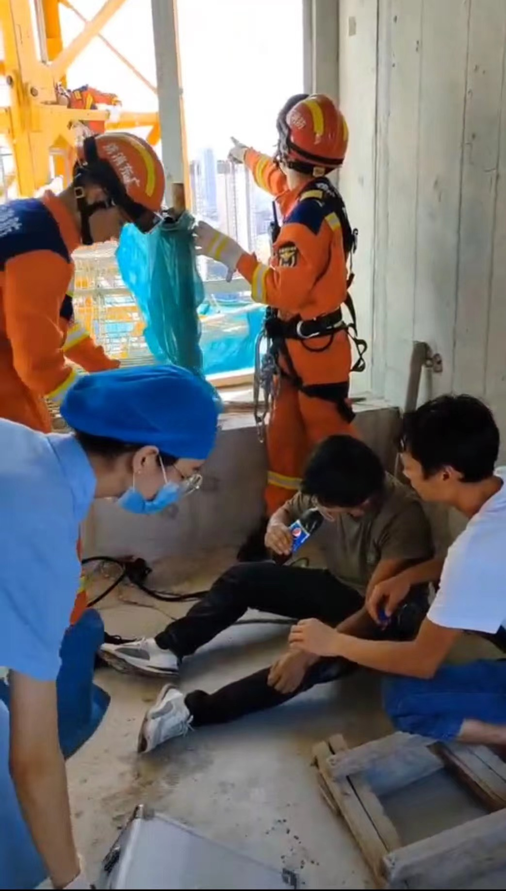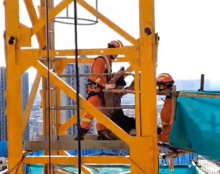 下午4時30分,現(xiàn)場指揮員果斷下達救援命令,兩名戰(zhàn)斗經(jīng)驗豐富、戰(zhàn)斗作風過硬的消防員隨塔吊司機共同登塔實施救援。