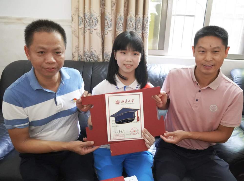 嚴(yán)梓卉和小學(xué)老師(左一)、 高中班主任(右一) 共同打開(kāi)北大錄取通知書。