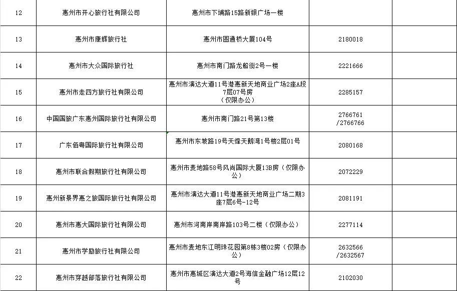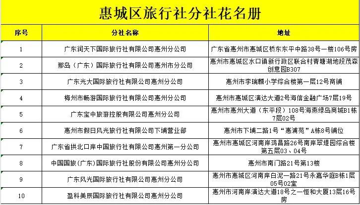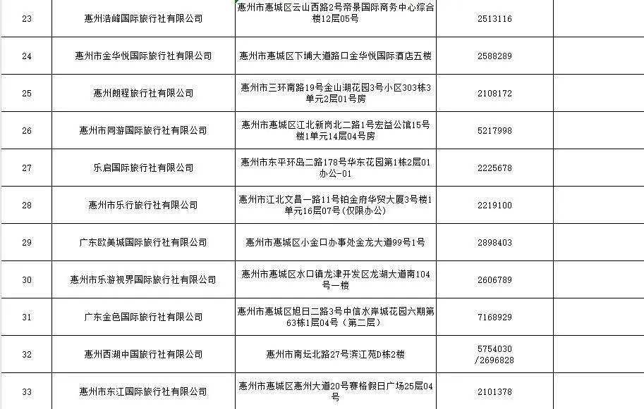 當前,惠城區(qū)注冊備案的旅行社及分社名單如下: