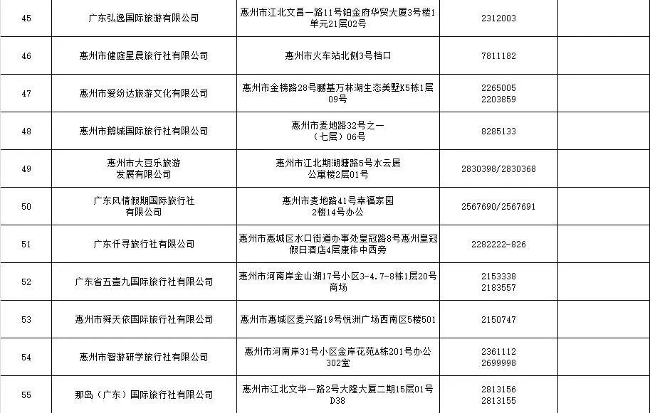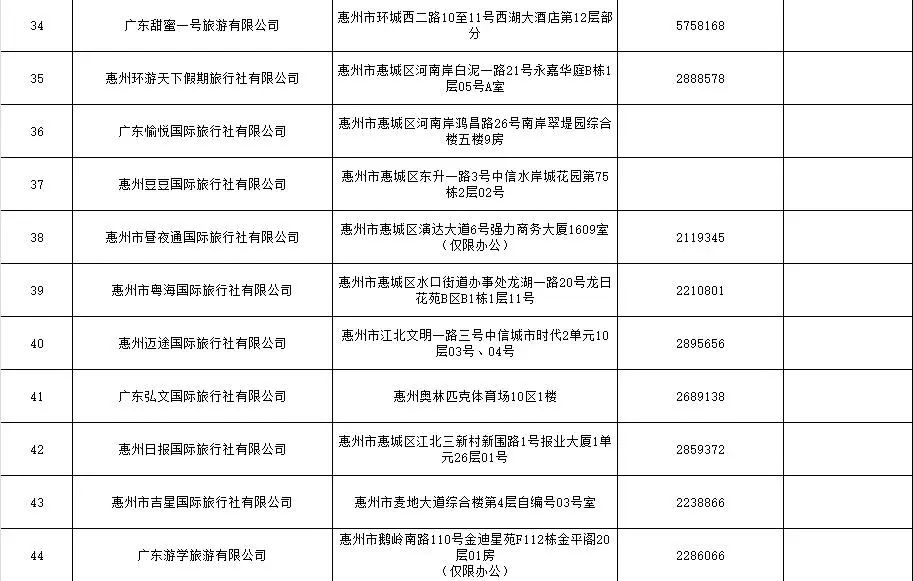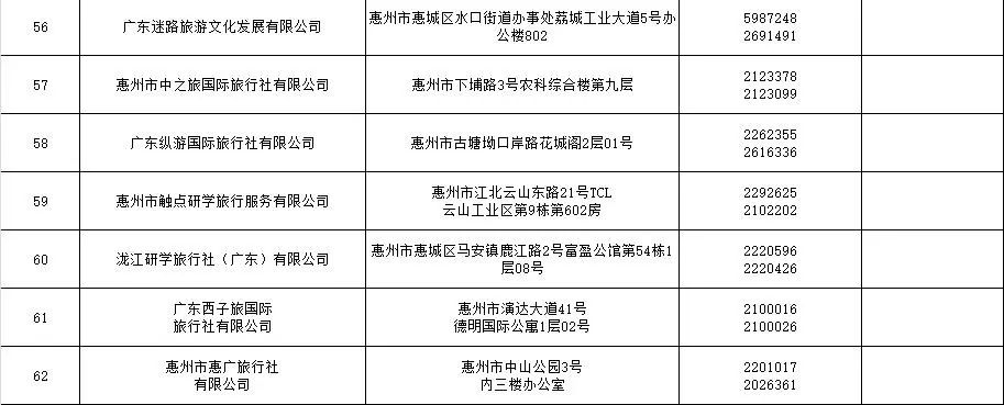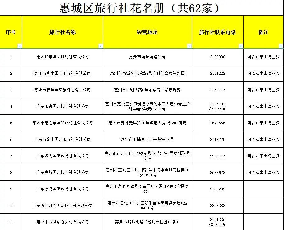 后期旅行社名單更新可登錄“惠州市惠城區(qū)文化廣電旅游體育局政府信息公開平臺”進行查詢,也可以關注“惠城文旅體”微信公眾號信息。