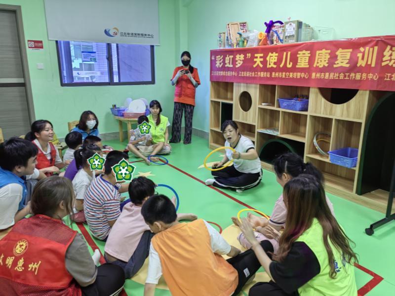 “雙百”社工和黨員志愿者為特殊兒童開展康復(fù)訓(xùn)練。