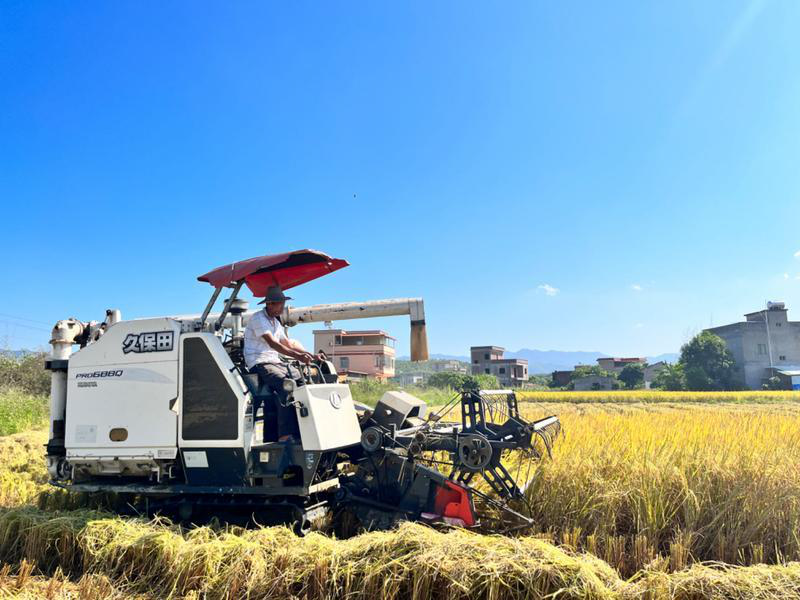 機(jī)械化收割一畝稻谷僅需十幾分鐘。