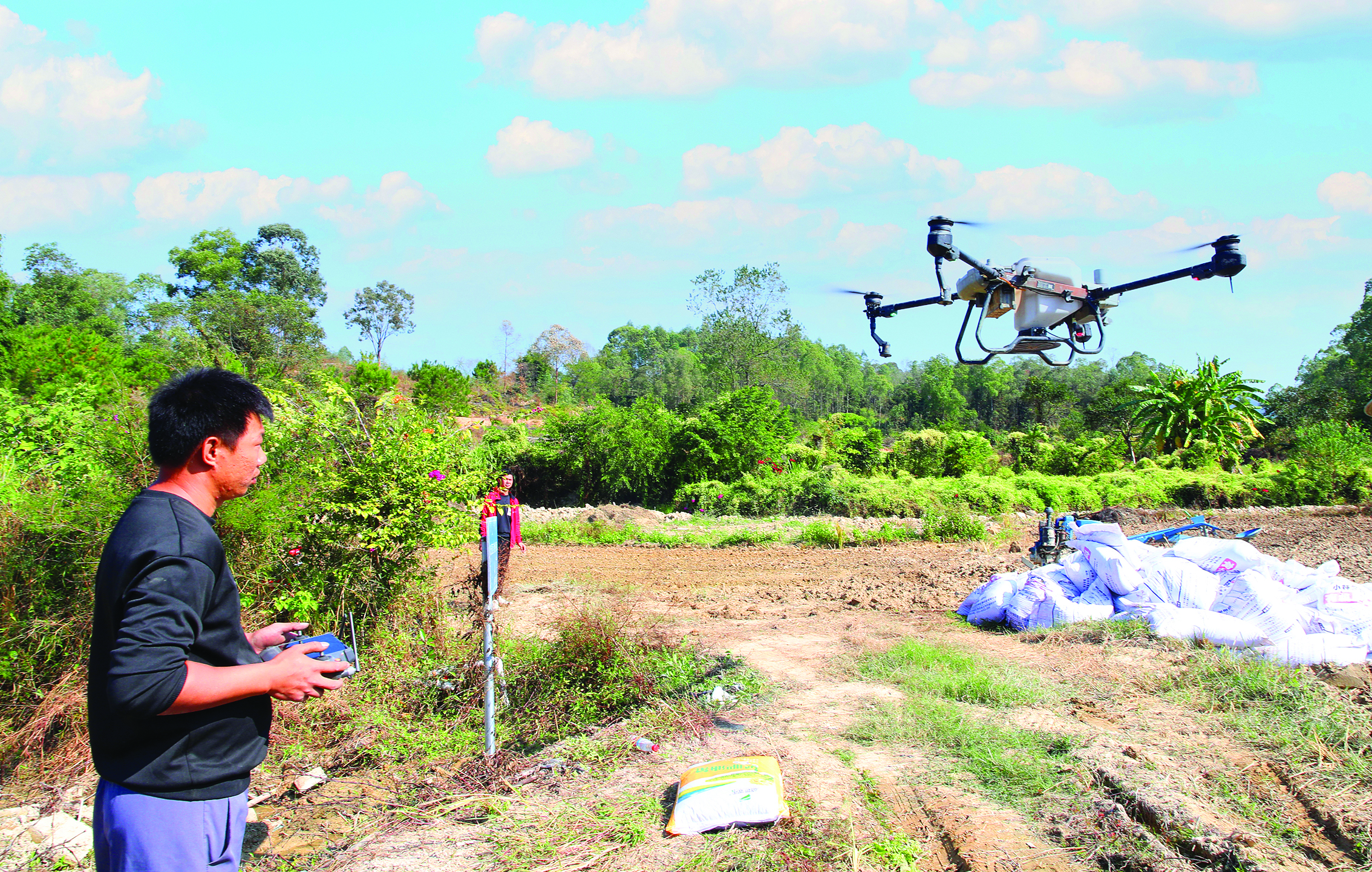 農(nóng)場(chǎng)工人用無(wú)人機(jī)施種油菜種子,2024年春節(jié)期間,這里將是一片花海。