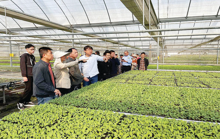 “水培大棚一畝地可擺放10個(gè)水培架,每畝一次大概能產(chǎn)2400斤左右,夏天1500斤左右。水培葉菜類(黃金快菜)一般上架27天后可采摘,一年可以循環(huán)12次,一個(gè)月一次……”在蔬菜有機(jī)基質(zhì)綠色水培示范區(qū)里,代表們圍在惠州市智慧未來農(nóng)業(yè)科技有限公司總經(jīng)理黃國(guó)順身邊,興致勃勃地聆聽他對(duì)此次觀摩會(huì)主栽品種——黃金快菜日常管理、產(chǎn)量和效益的介紹。