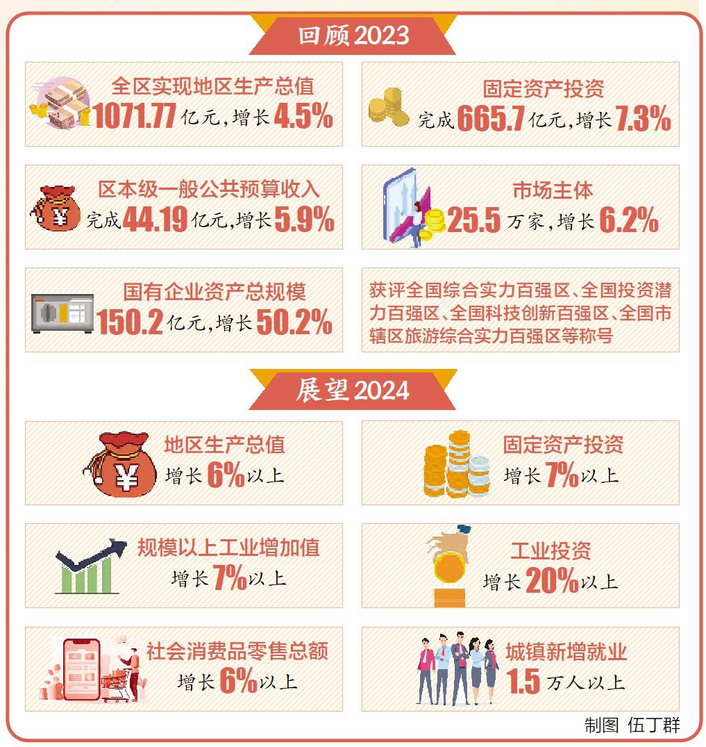 經濟發(fā)展承壓而上。全區(qū)實現(xiàn)地區(qū)生產總值1071.77億元,增長4.5%。固定資產投資完成665.7億元,增長7.3%。區(qū)本級一般公共預算收入完成44.19億元,增長5.9%。市場主體25.5萬家,增長6.2%。國有企業(yè)資產總規(guī)模150.2億元,增長50.2%。獲評全國綜合實力百強區(qū)、全國投資潛力百強區(qū)、全國科技創(chuàng)新百強區(qū)、全國市轄區(qū)旅游綜合實力百強區(qū)等稱號。