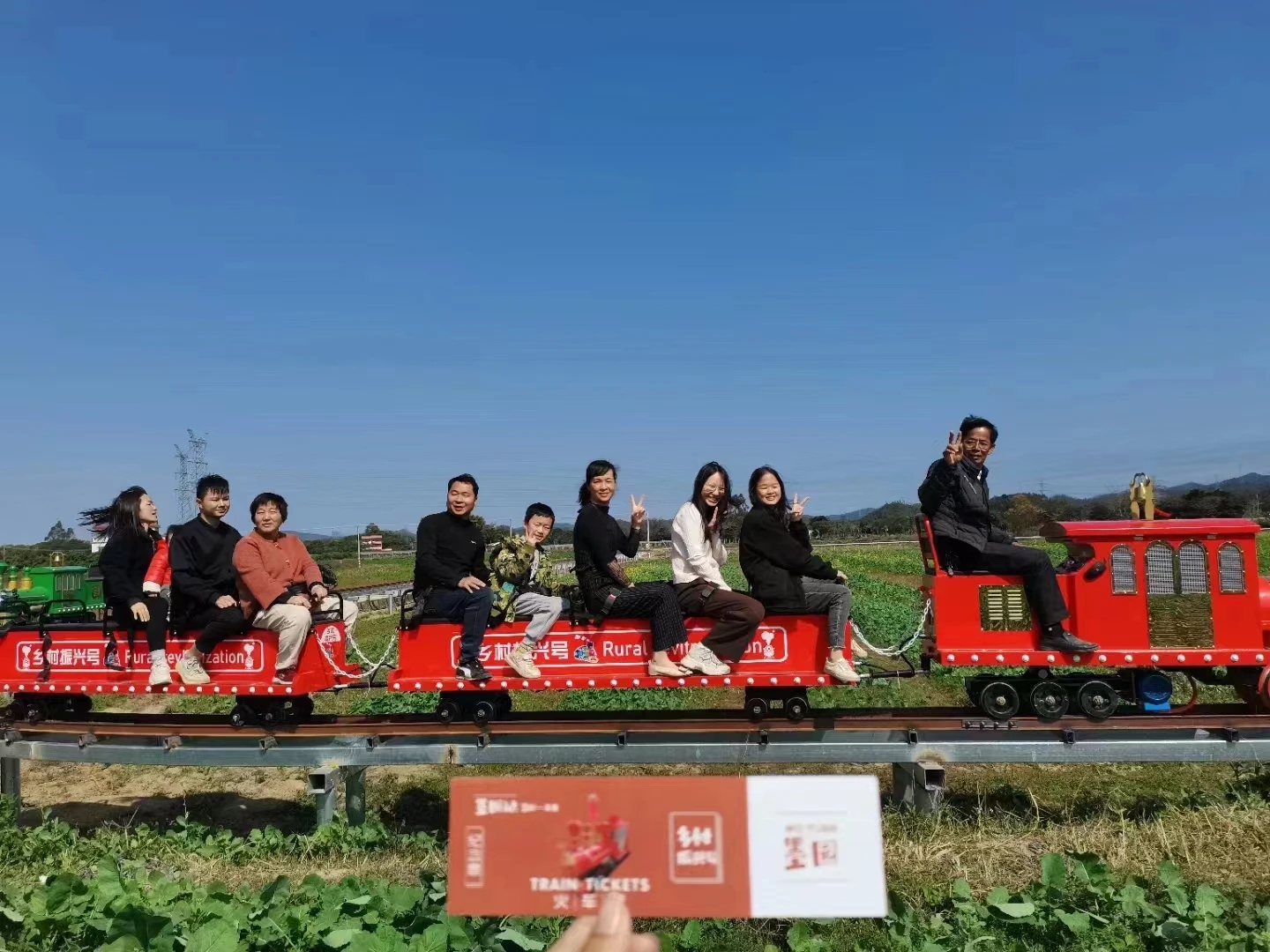 “變化”還走進村里。立春過后的田野,春意盎然、生機勃發(fā),油菜花含苞欲放,蝶舞花間。隨著一聲鳴笛,墨園村“稻田空間”稻田小火車“鄉(xiāng)村振興號”“幸福墨園號”開動起來。碧空之下的綠色田野格外鮮亮,“鄉(xiāng)村振興號”“幸福墨園號”承載著希望與未來,繞著鄉(xiāng)野緩緩開去,將田野風(fēng)光盡收眼前。