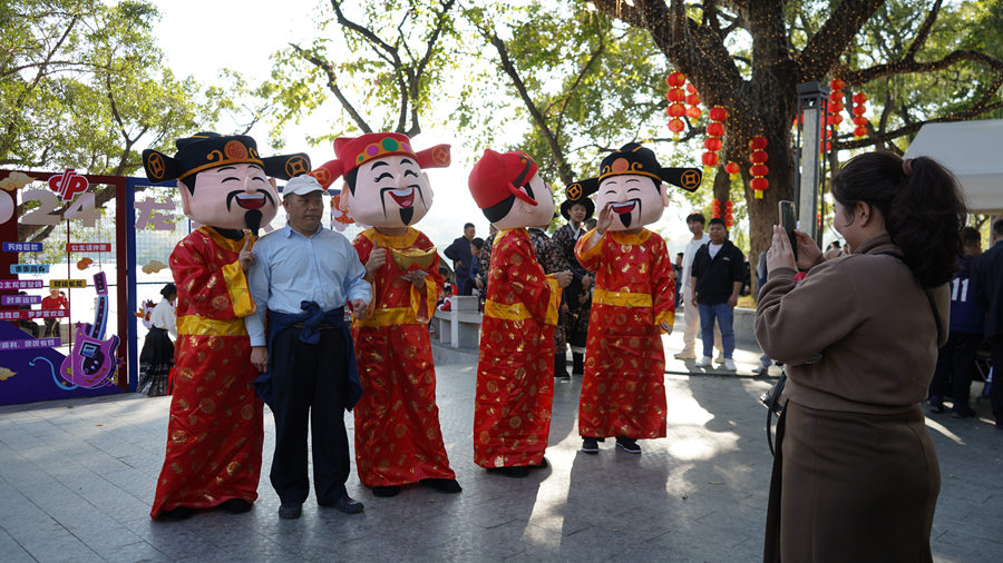財(cái)神人偶與游客互動(dòng)。