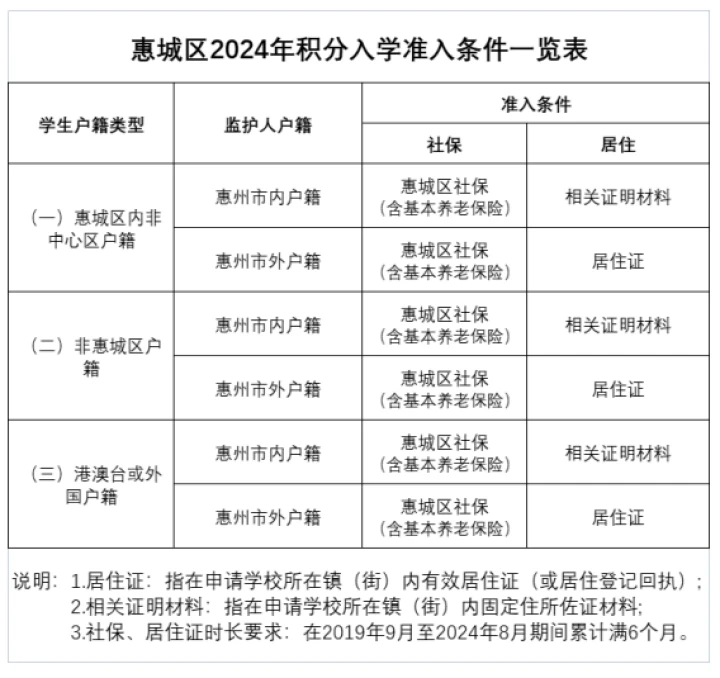 戶籍在惠城區(qū)非中心區(qū)(小金口、水口、三棟、汝湖、馬安、橫瀝、蘆洲等7鎮(zhèn)(街))的,其父親或母親或其他法定監(jiān)護(hù)人(以下簡(jiǎn)稱“監(jiān)護(hù)人”)在2019年9月1日至2024年8月31日期間,在惠城區(qū)參加社會(huì)保險(xiǎn)(含基本養(yǎng)老保險(xiǎn))時(shí)間累計(jì)滿6個(gè)月,并在戶籍地所在鎮(zhèn)(街)外居住時(shí)間累計(jì)滿6個(gè)月。