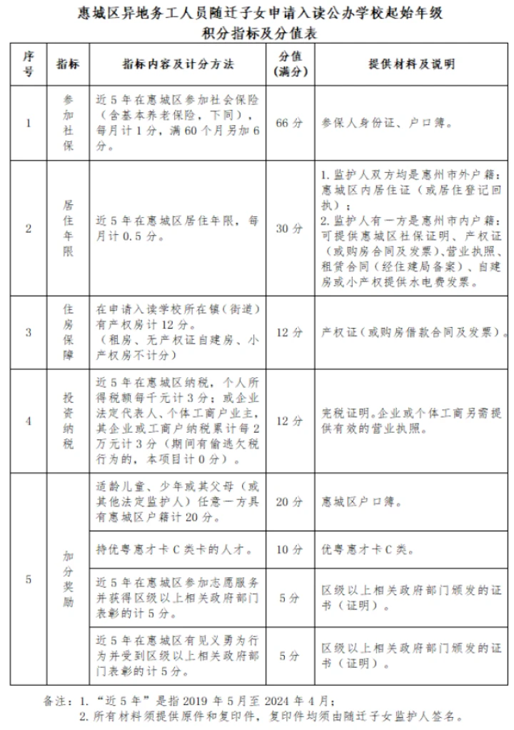根據(jù)中共惠州市委教育工作領(lǐng)導(dǎo)小組辦公室、惠州市人民政府教育督導(dǎo)室《關(guān)于切實(shí)做好我市進(jìn)城務(wù)工人員隨遷子女就學(xué)工作的通知》和惠州市教育局《關(guān)于建立義務(wù)教育階段隨遷子女積分入學(xué)制度的通知》(惠市教基〔2015〕11號(hào))及義務(wù)教育階段學(xué)校招生工作有關(guān)文件精神,2024年我區(qū)異地務(wù)工人員隨遷子女可通過積分入學(xué)入讀義務(wù)教育階段公辦學(xué)校起始年級(jí),F(xiàn)將積分入學(xué)相關(guān)政策做如下公告: