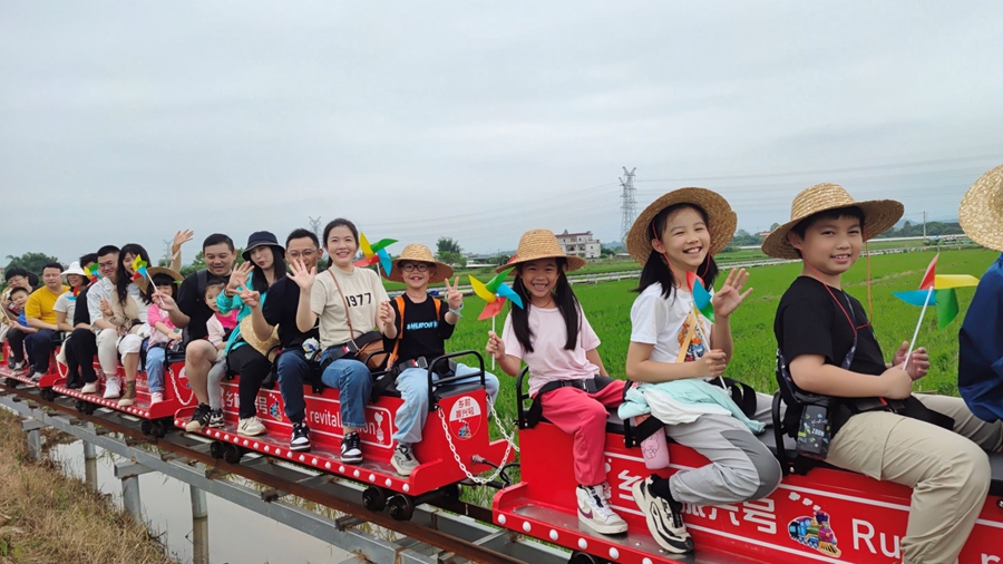 橫瀝鎮(zhèn)墨園村鄉(xiāng)村游火爆。這是游客在墨園村乘坐稻田小火車開心游玩;葜萑?qǐng)?bào)記者彭紅霞 通訊員劉紅蘭 攝