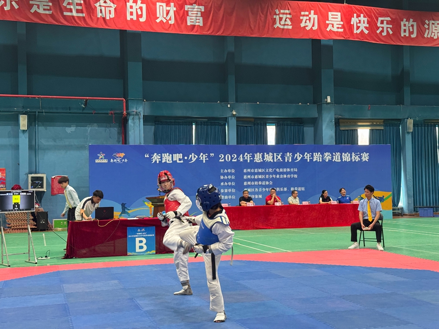 “奔跑吧·少年”2024年惠城區(qū)青少年跆拳道錦標賽比賽現(xiàn)場。