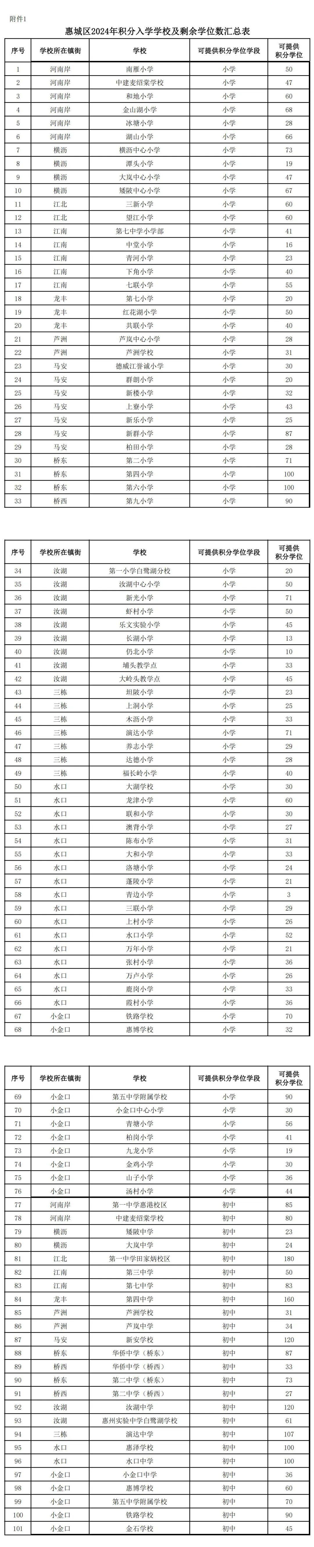 。ㄒ唬└鞣e分入學(xué)學(xué)校及剩余學(xué)位數(shù)見(jiàn)《惠城區(qū)2024年積分入學(xué)學(xué)校及剩余學(xué)位數(shù)匯總表》(附件1)。