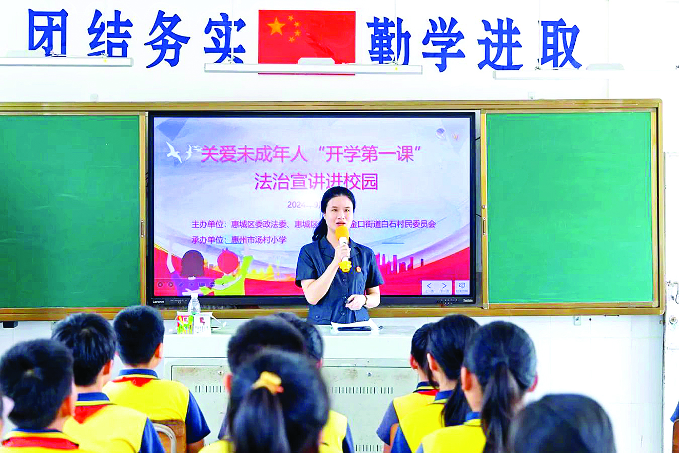 惠州日?qǐng)?bào)訊 (記者葉文青 通訊員杜欣 鄧易如)“法律是守護(hù)成長(zhǎng)的盾牌,從小樹(shù)立法治意識(shí),為未來(lái)筑起堅(jiān)實(shí)的保護(hù)墻。”為了增強(qiáng)未成年人的法律意識(shí)和自我保護(hù)意識(shí),日前,惠城區(qū)委政法委聯(lián)合區(qū)人民法院及“黨建引領(lǐng) 百村共建”結(jié)對(duì)村小金口街道白石村,走進(jìn)湯村小學(xué)和惠博學(xué)校,開(kāi)展護(hù)“未”在行動(dòng)“開(kāi)學(xué)第一課”法治宣講進(jìn)校園活動(dòng),為同學(xué)們送上一堂精彩紛呈的法治教育課。