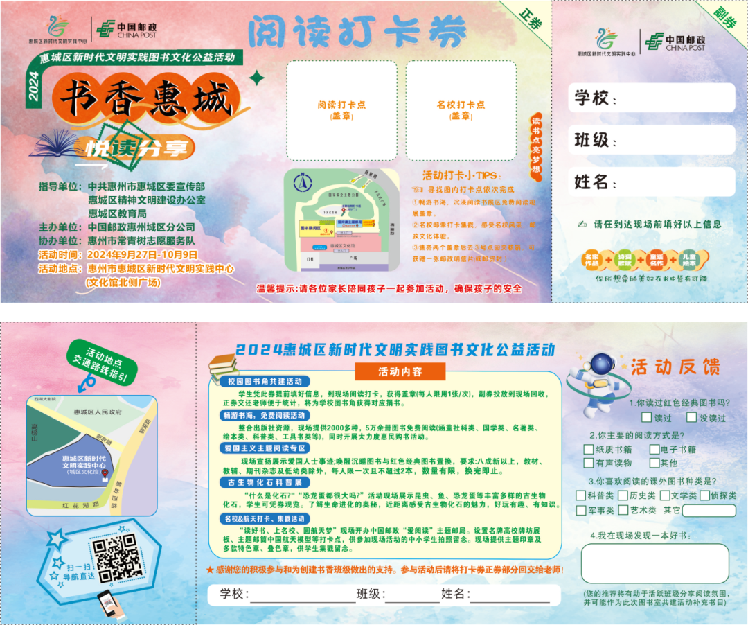 凡在活動現(xiàn)場完成閱讀打卡并蓋紀(jì)念章的學(xué)生,將為學(xué)校贏得校園捐贈圖書;顒蝇F(xiàn)場設(shè)立書展區(qū)、閱讀打卡區(qū),引導(dǎo)協(xié)助學(xué)生完成閱讀打卡并蓋紀(jì)念章。活動結(jié)束后由中國郵政惠城區(qū)分公司統(tǒng)一收集有效閱讀打卡券,經(jīng)核對后,中國郵政惠城區(qū)分公司按照每卡10元碼洋的標(biāo)準(zhǔn)向?qū)W校贈送相應(yīng)額度的圖書。