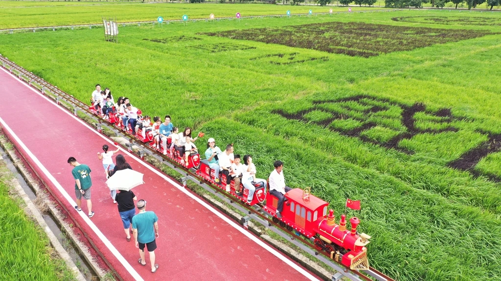 駛?cè)肽珗@村,稻田一邊是長(zhǎng)長(zhǎng)的車龍,在第一時(shí)間告知這個(gè)網(wǎng)紅村的熱鬧。“嗚嗚”稻田小火車?guó)Q笛了,坐上小火車去感受碧綠稻浪一波接著一波地涌動(dòng),秋風(fēng)遇稻浪,“唰唰”作響。