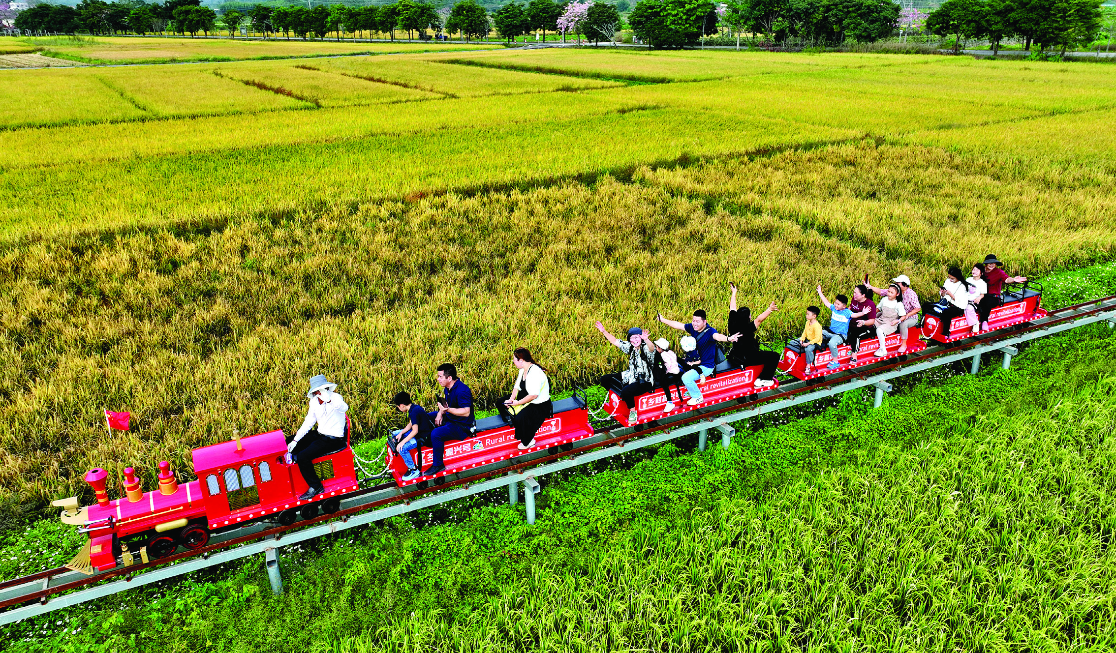10月27日,游客在惠城區(qū)橫瀝鎮(zhèn)墨園村乘坐稻田小火車,沉浸式體驗(yàn)秋收“豐”景。作為廣東省“百千萬工程”首批典型村,近年來墨園村以鄉(xiāng)村振興為主線,依托古建筑群、歷史文化,打造農(nóng)文旅串聯(lián)產(chǎn)業(yè)。營地喝咖啡、鄉(xiāng)間圍爐煮茶、稻田乘坐小火車等一個個鄉(xiāng)村文旅項(xiàng)目落地。秋收時節(jié),一撥又一撥游客走進(jìn)滿地金黃的墨園村,體驗(yàn)耕種的辛勞和收獲的喜悅。