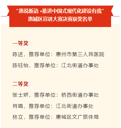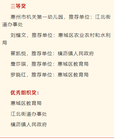 最終,惠州市第三人民醫(yī)院推薦的陳述、江北街道辦事處推薦的陳鈺怡獲得一等獎(jiǎng),另有3名二等獎(jiǎng)、5名三等獎(jiǎng),惠城區(qū)教育局、江北街道辦事處、橫瀝鎮(zhèn)人民政府獲優(yōu)秀組織獎(jiǎng)。