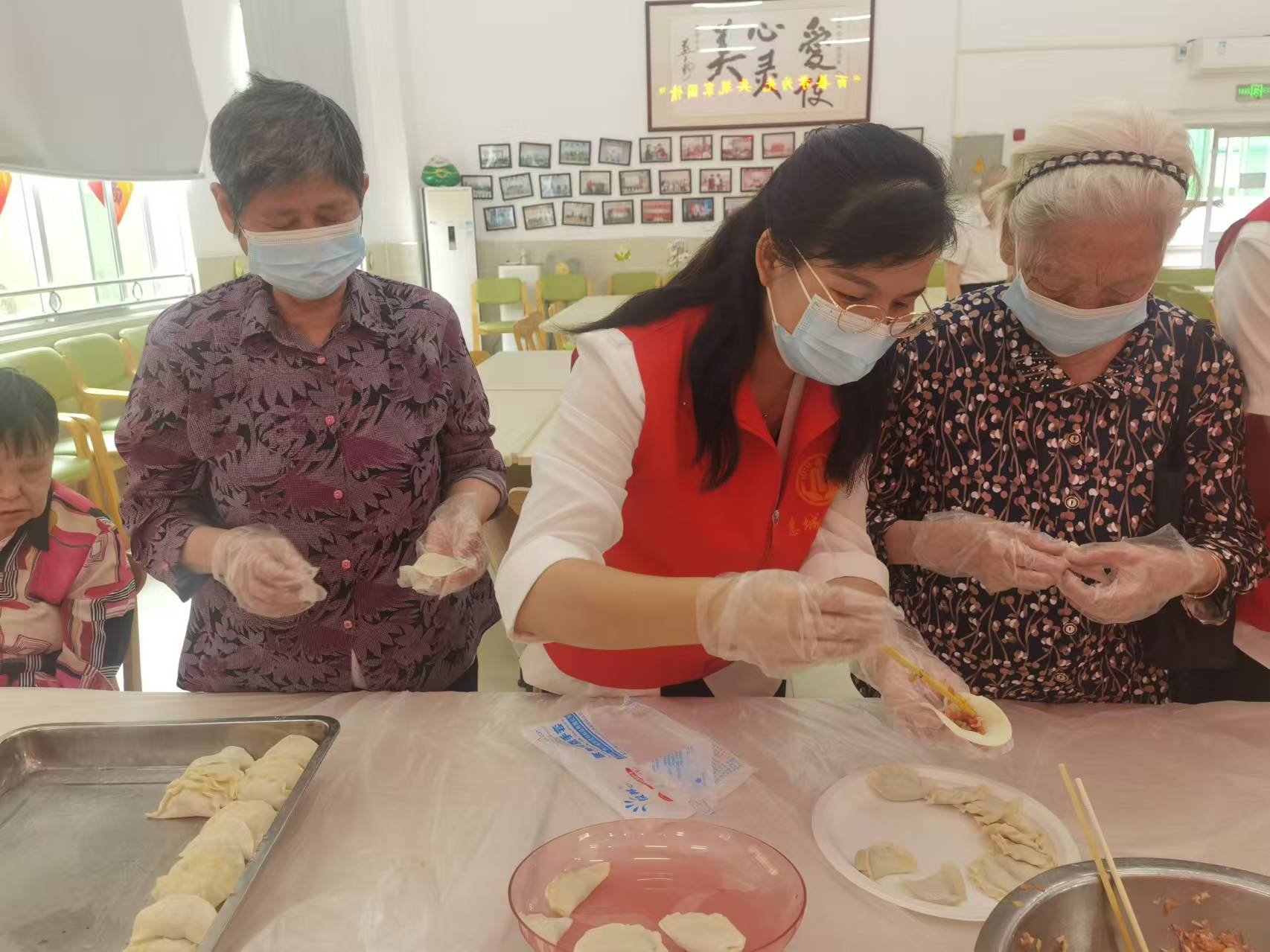 鐘英紅(中)參與養(yǎng)老服務(wù),與社區(qū)長(zhǎng)者一起包餃子。