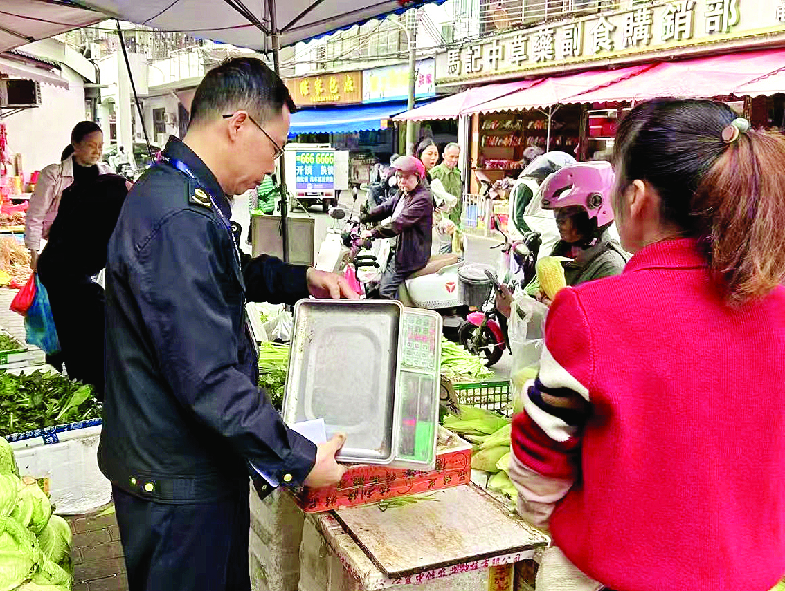 執(zhí)法人員在檢查農(nóng)貿(mào)市場(chǎng)電子秤。